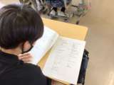 しおりに沿って、野外学習の動きを確認しています。児童たちは、メモをとりながら参...