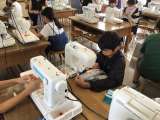 5年生の家庭科です。ミシンを使ってエプロンを作っています。縫う部分に折り目をし...