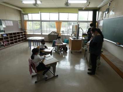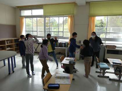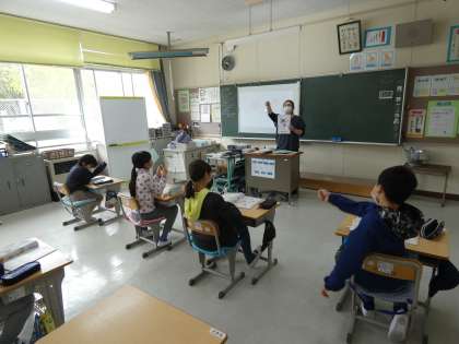 外国語の授業 公開日 2021/04/17 更新日 2021/04/17 お知らせ 今日は、外国語の授業にALTさんが来てくれました。テンポのよい授業や動きのある授業はとても楽しそうです。写真は、「What is your name? My name is ○○」と話ながらペアをかえながら移動しているところです。どのクラスの授業も楽しそうです。