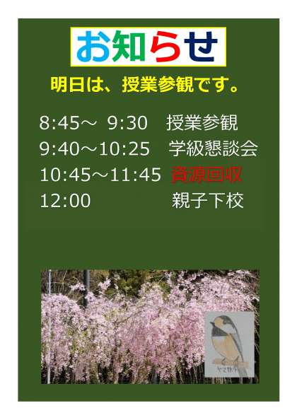 明日4月24日は授業参観です。日程は8時45から9時30分までが授業参観、9時40分から学級懇談会、10時45分から資源回収、12時00分から親子下校です。駐車場は、運動場隅につめて駐車するようにお願いします。また、廃品回収がありますので授業参観と学級懇談会も活動しやすい服装でお越しください。(教職員も活動しやすい服装で授業させていただきますのでご理解ください。)ご協力よろしくお願いします。