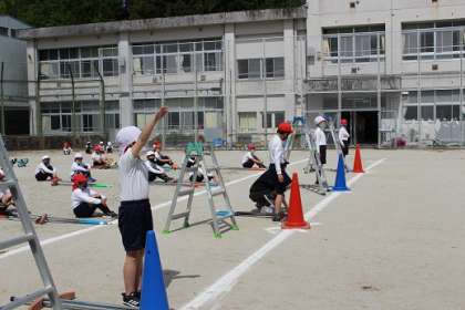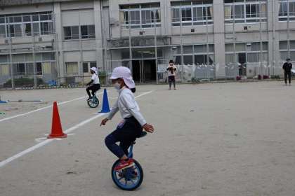 運動会の種目、グランプリレースの全校練習をしました。カッポン、竹馬、一輪車と自分の出来る競技でスピードを競います。運動会に向けて各自練習していきましょう。