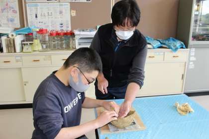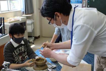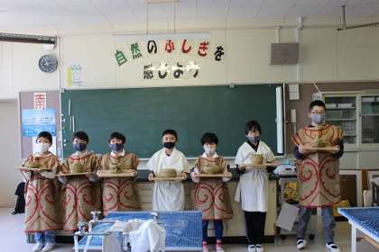 縄文時代の衣装を着て、自作の縄文土器と一緒に記念撮影もしました。