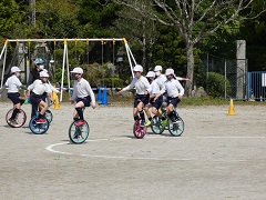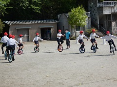 一輪車の全校練習が始まりました。昨年の演技を越えようと練習に燃えています。
