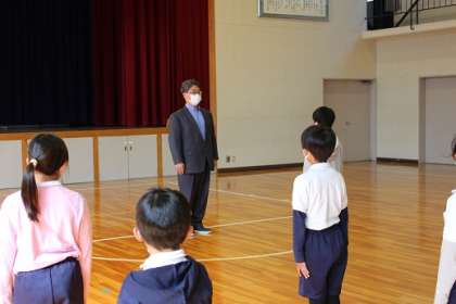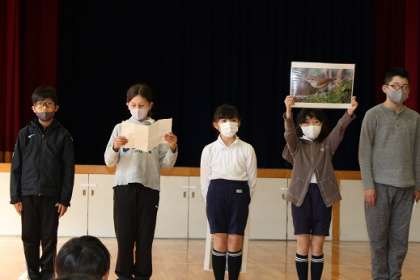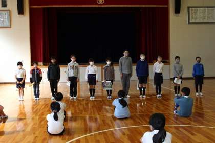 学校集会が体育館で行われました。11日火曜日の姿見検定に向けて、愛鳥委員会が問題を出してくれました。今度の姿見検定は、コロナ対策でチームスを使って教室ごとに分かれて検定を受けます。