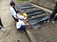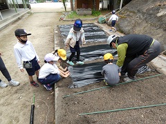 低学年学級は、学級農園を耕し、ビニールシートを掛けました。さて、どんな野菜を植えるのでしょうか。