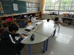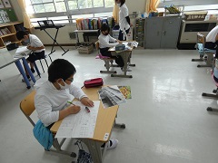 5年生と6年生は、図工の授業で遠近法を使って滝脇小学校の校舎を描いていました。どの絵もとても丁寧に描かれていました。