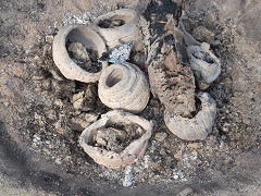 運動場に穴を掘り、薪を敷いて、周囲に縄文土器を並べて、ゆっくりと低温で温めていき、最後は、直焼きしました。朝から夕方までかけてじっくり焼きました。誰一人として土器が割れませんでした。どんな出来映えかは、明日お知らせします。