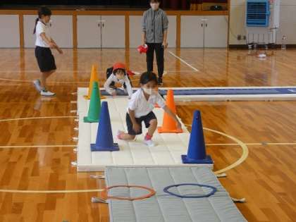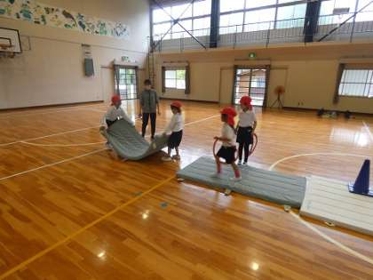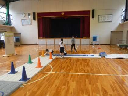 1年生と2年生の体育の授業では、マット遊びを行っています。自分たちで協力して写真の様なコースを作り、そのコースを、毎日練習しているマットの動きを使ってクリアしました。