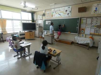 3年生の算数の授業では、1万をこえる数の勉強をしています。サッカー場の入場者の数も数えれるようになってきたようです。
