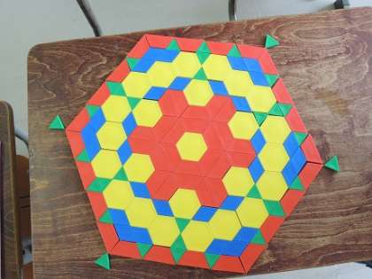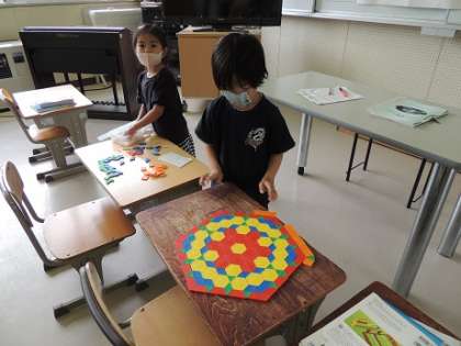 1年生の算数では、三角形やひし形、6角形などの形のパターンブロックを使って写真の様な形を作っています。いろいろな形の感覚をつかんでいきます。