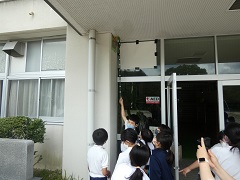 巣作りが遅かった玄関のツバメたちが卵を温め出しました。ツバメ調査を行っている4年生と3年生は興味津々です。