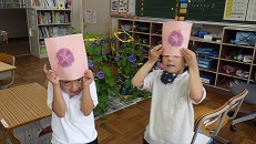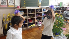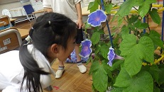 1年生は、育てた朝顔の花で「たたき染め」をしました。