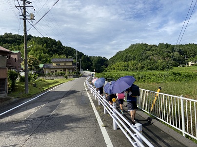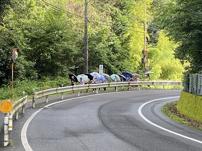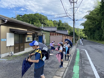 コロナ対策と熱中症対策の両立を目指して今年も写真のように傘刺し登下校をしています。途中、しっかりと給水もしています。