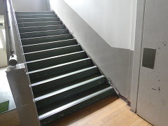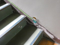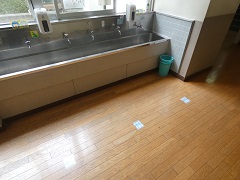 学校の階段には、人との距離を意識するために小人のマークが貼られています。手洗い場にも次の児童の待機するポイントが貼られました。