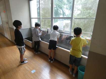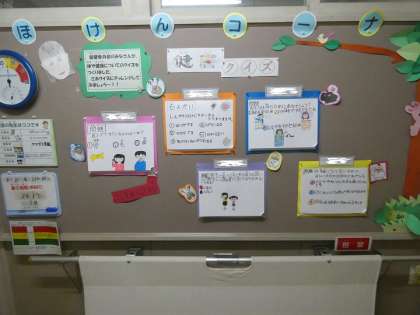 保健室の前の掲示板には保健委員が作った健康についてのクイズが掲示されていました。健康に対する意識が高まってきたのでしょうか。6年生の子たちの手洗いの様子もとても丁寧に手を洗っているし、ソーシャルディスタンスも意識されています。