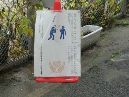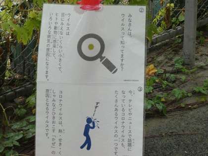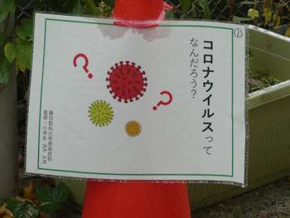 ソーシャルディスタンスを保つためのカラーコーンには、コロナ対策のまめ知識のカードが貼られています。