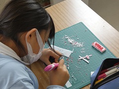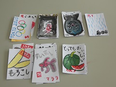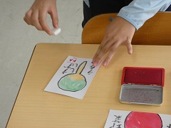 高学年の図工の授業では、完成した絵手紙に自作のゴム印で押印し、完成させました。夏のイメージの絵手紙に名前の印が押されていると本格的に見えますね。