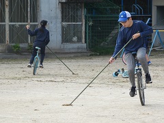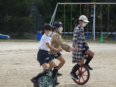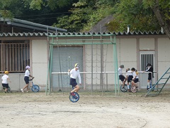 写真は、放課の一輪車の練習風景です。それぞれが、自分のレベルに合わせた目標達成に向けて練習方法を工夫して練習していました。