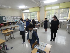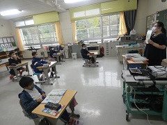 ALTの先生の英語の発音を聞き分けて、地図を使って進む学習をしました。なぜか、私だけ「ライト」と「レフト」の発音を聞き間違えて、子どもたちと向かい合ってしまいます。子どもたちの耳はしっかり聞き分けれるので感心しました。