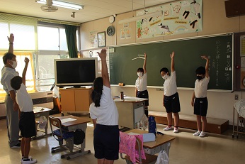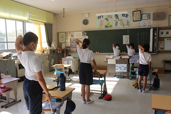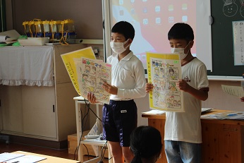 保健委員さんが、朝の会の時に教室をまわり、正しい姿勢の大切さを訴え、手作りポスターを配付したり、正しい姿勢を作るためのストレッチを教えたりしてくれました。