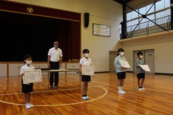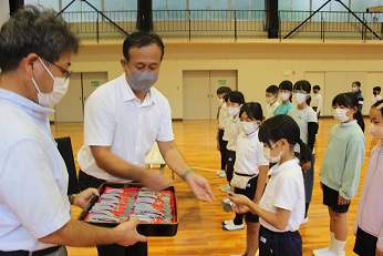 10月7日 学校集会 公開日 2021/10/07 更新日 2021/10/07 お知らせ 久しぶりに体育館で集まって学校集会を行いました。校長先生から、運動会に向けてがんばっていこう。運動会テーマ「みんなかがやけ 心をもやせ 熱血滝っ子運動会」に負けない立派な運動会にしましょうというお話がありました。そして、愛知県野生生物保護実績発表大会県知事賞に対する豊田市教育委員会表彰でいただけるメダルを一人一人に授与されました。