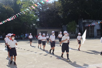 赤白に分かれて、入場しました。 赤白の組の団長が元気に選手宣誓をしました。