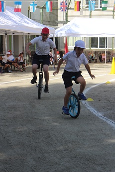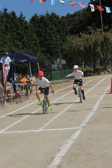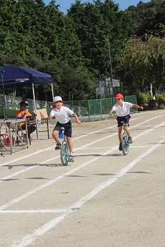 運動会6 赤白グランプリレース 一輪車の部 公開日 2021/10/09 更新日 2021/10/09 お知らせ 今年の一輪車は、2人でトラックでレースをしました。スピードを出すために、限界まで前掲したり、コーナーで加速したりする挑戦に観客も息をのんで見守りました。