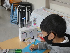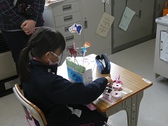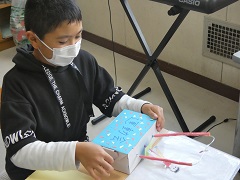 高学年は、くるくるクランクを作っています。いろいろなアイディアがあってとてもおもしろいです。運動会を表現したり、反復横跳びを表現したり、海の上の景色を表現したりなど様々な発想がとてもいいです。