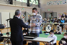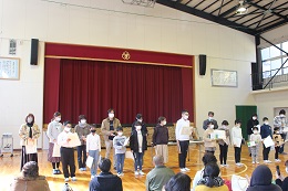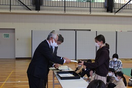 交推協表彰式 公開日 2021/11/13 更新日 2021/11/13 学校行事 学芸会の後、夏休みに募集した交通安全についてのポスターや標語の表彰式が行われました。本校は、保護者の大人の人もたくさんポスターや標語を応募してくれます。 表彰式では、交推協の会長さんが一人ひとり丁寧に賞状を渡してくださいました。学芸会の後に行われた表彰式はとてもよい雰囲気で進行しました。本当にいろいろな場面でご協力していただきありがとうございます。