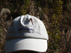 講師の方は、野鳥の話だけでなく、獣の話や昆虫、植物などの話もたくさん教えてくれます。赤トンボについて話していたら先生の帽子に赤トンボがアクセサリーのようにとまっていました。