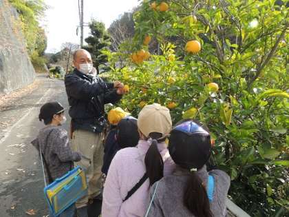 低学年の町探検の授業、今日は林添町の萬木園を訪問しました。柿や柚子の実をとったり、ツリーハウスを見たり、社長のお話を聞いたりしました。今日も滝脇小学校区の新しい発見がたくさんあったようです。
