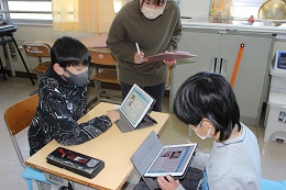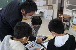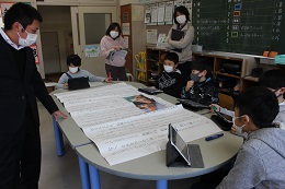 6年生は、説明文の中の写真などの有効な活用の仕方について話し合いました。少しずつ話し合いのルールにも慣れ、上手に話し合いができるようになってきました。全校の先生が見に来ているせいか少し緊張しているようですが自分の考えをしっかりと伝えていました。タブレットパソコンも上手に使いこなしていました。