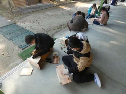 巣箱作りの続きの作業をしました。春になりシジュウカラやヤマガラが安心して雛を育てられるようにしっかりと釘を打っていきます。
