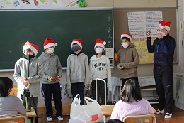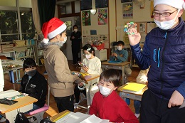メリークリスマス。朝の会の時に、6年生サンタさんが教室をまわり、滝脇小のよい子たちに何かプレゼントを届けてくれたようです。