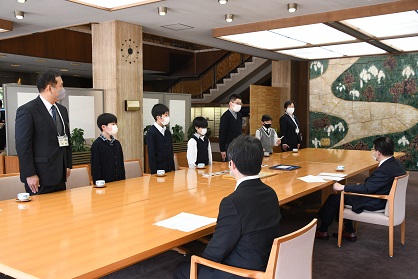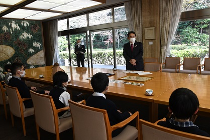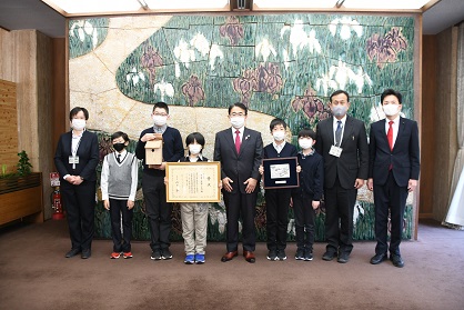愛知県庁を訪問し、大村知事に全国野生生物保護活動発表大会での環境大臣賞の報告と現在の滝脇小学校の愛鳥活動について堂々と報告している様子が伝わってくる写真です。