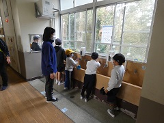 学校では、感染対策を徹底したり、内容を制限したりしながら授業を行っています。長放課では、子どもたちは運動場で遊ぶのを楽しみにしています。外で遊んだ後は、手洗いをしっかりと行っています。