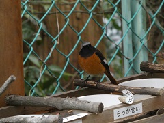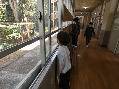 この写真は、長放課に運動場で元気に遊んだ後、手洗いを済ませて教室に入る前に給餌台に野鳥が来ていないか、目隠し板の間からそっと給餌台を覗いている子どもたちの写真です。この写真は滝脇小学校の子ども達を象徴するような写真であり、こういった風景がとても好きです。メジロが好きなみかんをジュースにして給餌台にセットしたり、ピーナッツで輪を作ってみたりして、どうやったら野鳥がたくさん集まって餌を食べてくれるのかを工夫しています。
