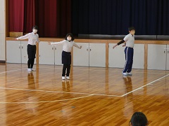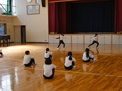 中学年の体育の授業ではダンスに取り組んでいます。3人から4人のグループにわかれて、それぞれのグループがふりをアレンジして踊ります。みんな上手でびっくりしました。