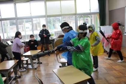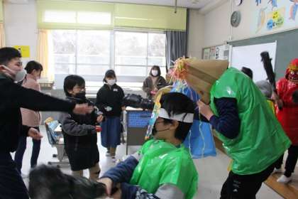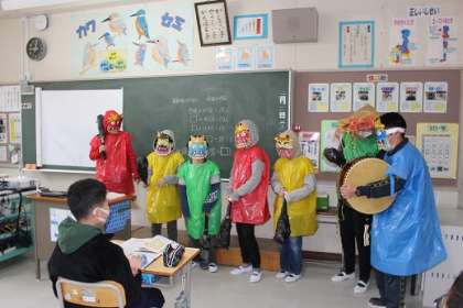 2月3日 節分 公開日 2022/02/03 更新日 2022/02/03 お知らせ 下級生に豆まきをしてもらおうと6年生が鬼になってくれました。感染対策のため大きな声を出したり、捕まえたりすることはできませんが、太鼓の大きな音と共に鬼が教室に入ってくると子どもたちは、「鬼は外。福は内。」と鬼に向かって豆まきをしました。6年生の皆さん、クリスマスのサンタ役に続いて、コロナ禍でも学校が明るくなるような楽しい企画をありがとう。「コロナ」という「鬼」に負けないでがんばりましょう。