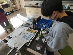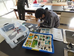 プログラミング学習を学習するためのレゴの教材を使って勉強しました。子どもたちは、時間内に完成させようと集中していました。