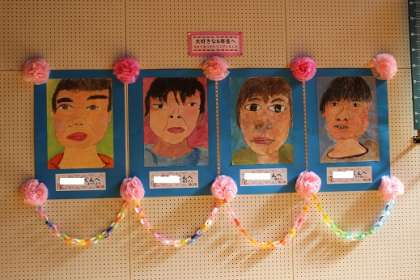 6年生と6年生担任の似顔絵は1年生と2年生が心を込めて描きました。