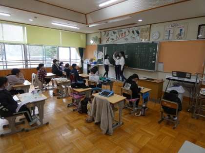 先週、6年生が卒業し、玄関には卒業記念品のバードカービングが飾られています。6年生が卒業した後、5年生が中心に学校生活を送っています。写真は、ワックスがけをした後のピカピカの教室の床と中学年がお楽しみ会の計画を話し合っている様子です。
