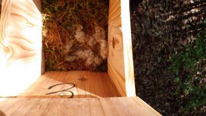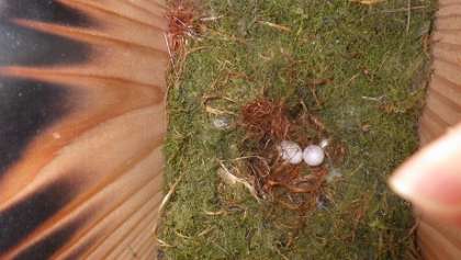 今春第1回目の営巣調査が行われました。雨で滑りやすかったために今回は5年生だけで営巣調査を行いました。巣箱には、苔が運びこまれているものがたくさんありました。そして、なんと写真の様にヤマガラの卵が2つもありました。例年よりもずいぶんと早い産卵だったようです。