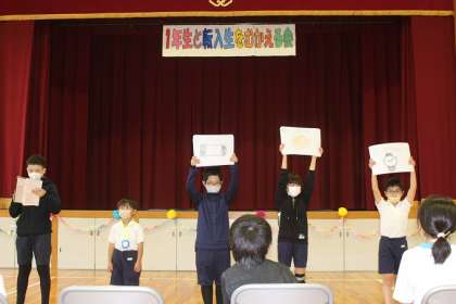 「1年生と転入生紹介クイズ」をしました。「好きな教科は何ですか」「好きな遊びはなんですか」などのクイズに、3択で答えます。国語が好きだったり、体育が好きだったり、道徳が好きだったり、その答えにみんな一喜一憂していました。友達の意外なところも知ることができて、大盛り上がりでした。