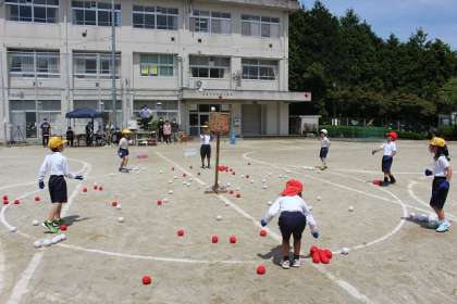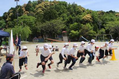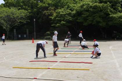 運動会の予行練習で、玉入れや綱取りを行いました。今年は、綱などの器具の準備を5・6年生が行っています。