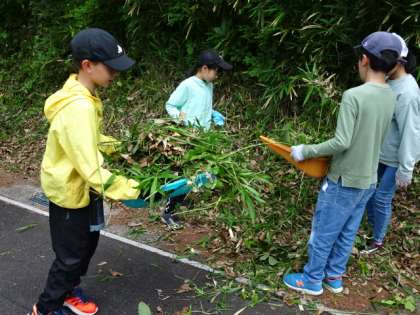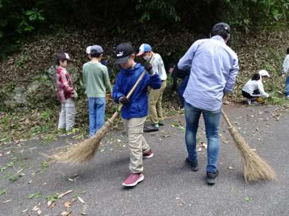 地域の方たちは、子どもたちが来る前に二畳ヶ滝に集まり、豊田市議会議員議長の板垣様に激励をいただき、草刈作業を始めました。子どもたちと保護者の方は、ゴミ拾いをしながら二畳ヶ滝に向かい、地域の方たちと合流すると、集めた草や落ち葉を捨てたり、看板をみがいたりしました。