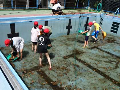 今年度は、感染症対策を行いながら、水泳学習を行います。子どもたちにとっては、2年ぶりのプールです。そのために、今日は、全校児童でプール掃除を行いました。プールの中は落ち葉がいっぱいでした。プラみで落ち葉を集めて外に捨てたり、プールの底をデッキブラシで磨いたりしました。