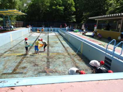 子どもたちの頑張りのおかげで、プールがこんなにきれいになりました。プール開きが楽しみです。