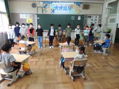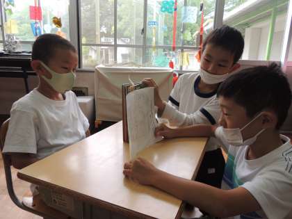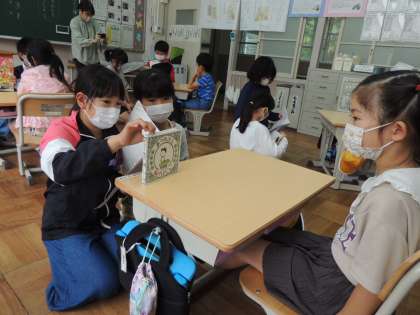 3・4年生が、1年生に、自分のお気に入りの本を紹介しました。自分が1年生の時に読んでおもしろかった本を分かりやすく紹介してくれたので、1年生も「読みやすい」「おもしろい」「全部読みたい」と大喜びでした。