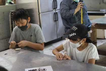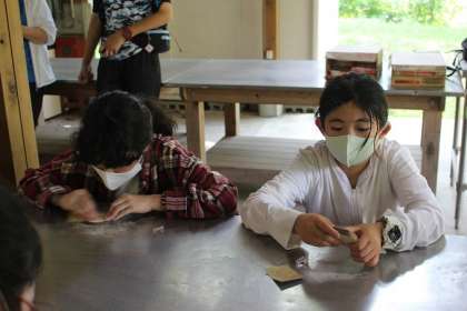 ウッドバッジづくりでは、まず、木の表面をつるつるにするために、紙やすりで一生懸命こすりました。